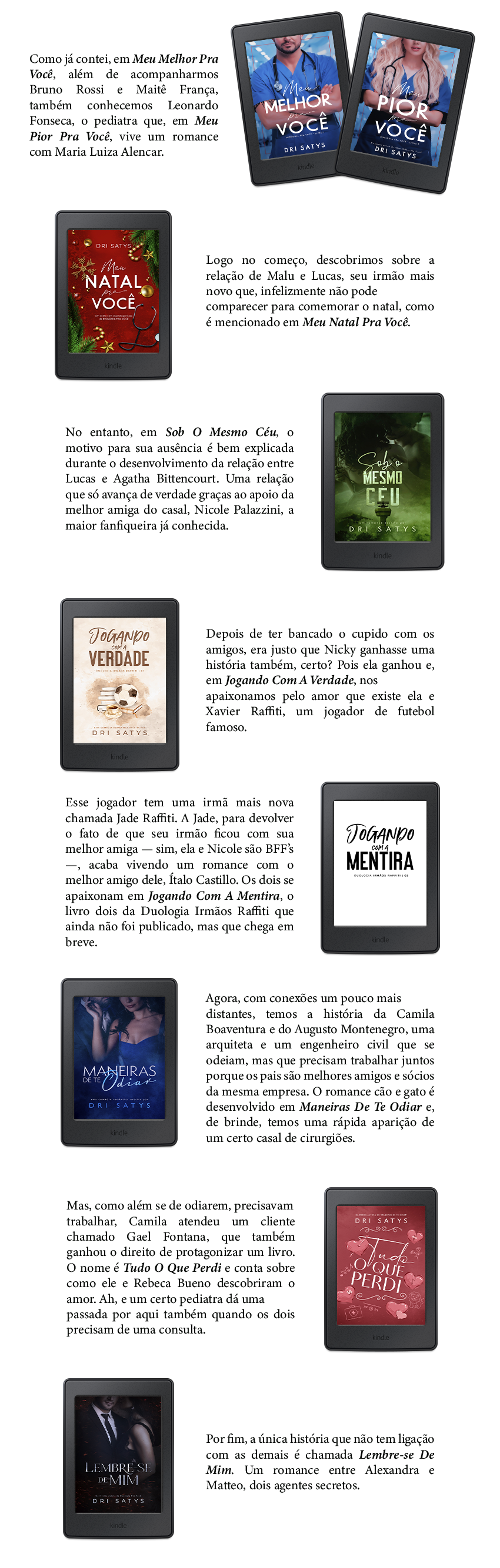Estou explicando tudo isso só para que não se sinta pressionada a ler todos os meus livros já publicados porque não há a necessidade. Entretanto, caso esteja curiosa para saber mais, vou indicar a ordem de leitura que evita spoiler, ok?